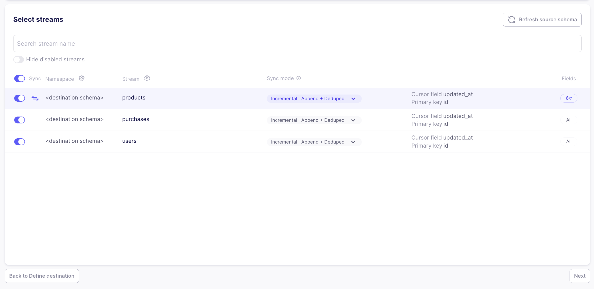 Next, you can toggle which streams you want to replicate. Our test data consists of three streams, which we've enabled and set to Incremental - Append + Deduped sync mode.